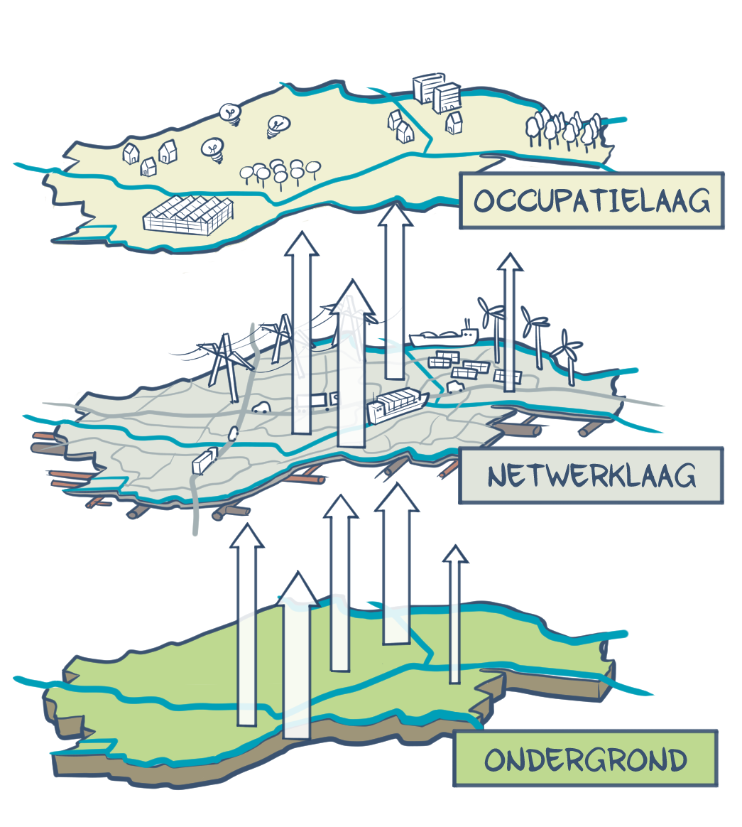 Dit omvat alle zichtbare en onzichtbare infrastructuur. Denk aan wegen, spoorwegen en vaarroutes, riolering, waterleiding en elektriciteitsnetwerken, maar ook groene structuren. Dit ligt op middeldynamisch niveau met een verandertijd van 20-80 jaar. - De ondergrond