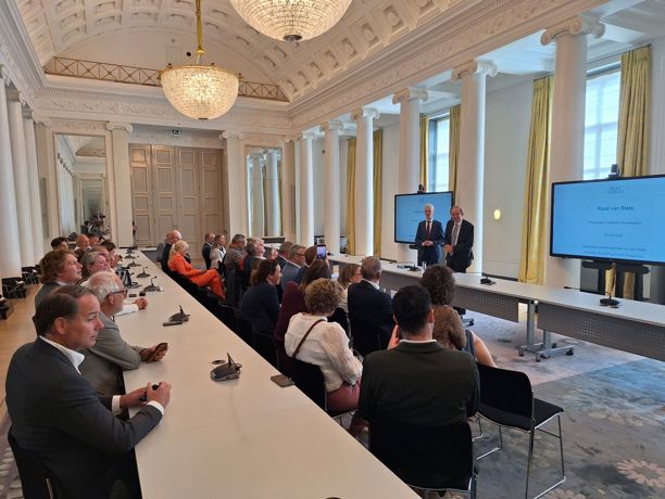 De Raad van State verwelkomde ons daarna met open armen. Staatsraad mr. Kees van der Staaij – met roots in Tiel – en mr. Arnold Weggeman, directeur Advisering vertelden ons over deze afdeling die jaarlijks zo'n 350 adviezen opstelt. Ook werd gesproken over maatschappelijke ontwikkelingen en hun invloed op wetgeving. De rondleiding door het historische ‘Witte Paleis’, onder de deskundige en humorvolle leiding van Pieter-Bas Beekman, gaf een bijzondere inkijk in de rijke geschiedenis van dit 'Paleisje op de Kneuterdijk', ooit bewoond door Koning Willem II en Anna Paulowna.