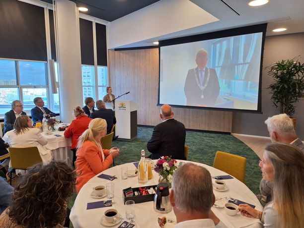 Wij begonnen de dag met een ontbijt in de ‘Haagsche Lobby’ van de gemeente Den Haag. Burgemeester Jan van Zanen verwelkomde ons door middel van een videoboodschap, waarna Wilma Verschoor - Hol – geboren in Tiel en nu directeur Bestuurszaken – ons meenam in de uitdagingen van de Hofstad en het belang van samenwerking tussen stad en regio. Peter van Heerwaarden vertelde ons het een en ander over de aanstaande NAVO Top.